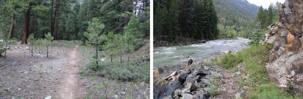 From here the trail stays pretty level as it follows the Animas River. If it’s rained recently, you’ll want rain gear, as the foliage covers the trail in many areas and you’ll get very wet. There are many places to camp along this stretch.