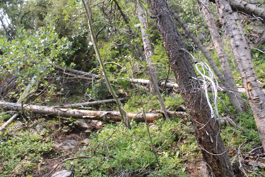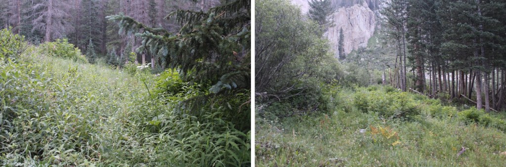 The goal now is to ascend into the upper basin. There is a trail here, but once again, a lot of downed trees and very overgrown with grass, flowers, etc. Keep heading east, staying below the rocks to your left.