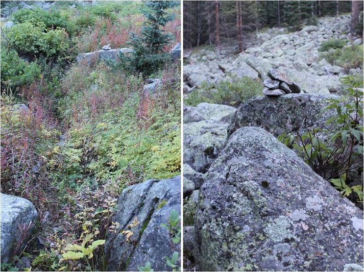 You’ll pass through a rocky area, with raspberry bushes and cairns to guide you