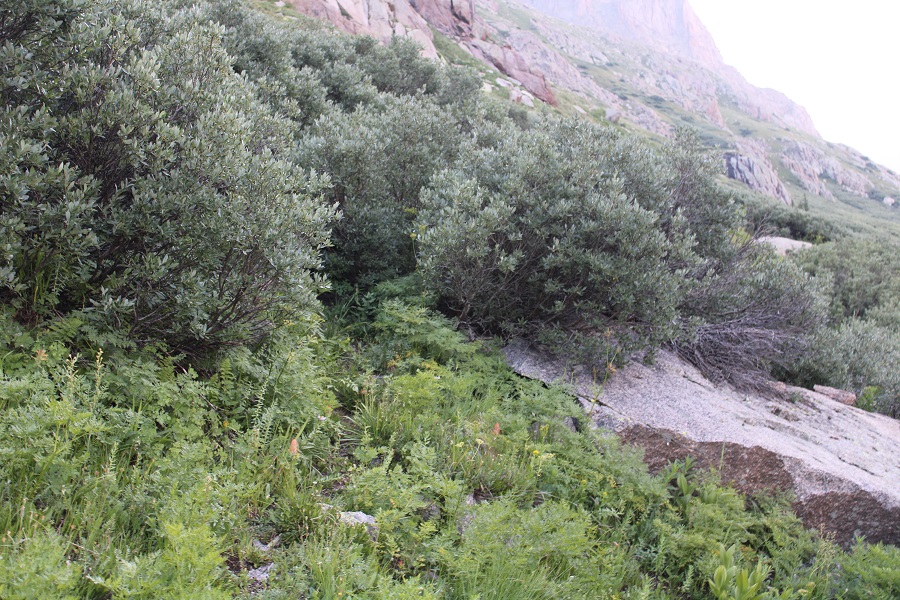 Where you’ll be greeted with: Willows! It is now your job to navigate through these willows to Ruby Basin. I promise you, there are trails here that ‘go’. They’re goat trails and anything above your waist will be gnarly, meaning you should plan on getting whacked in the face with willow branches, but trails are here. It’s important to find the entrance to the trail, and then go with your gut. Obvious cairns are circled in red. You’re aiming for the orange arrow: