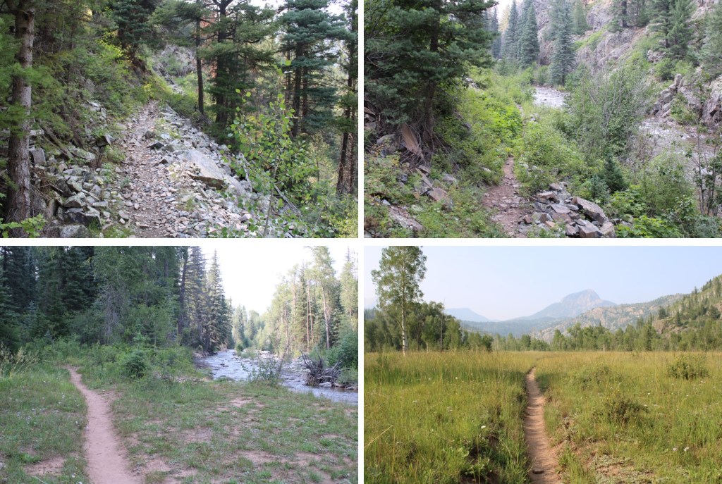 From here, the trail is class 1 as it heads east for 1.3 miles, and then turns right and follows Cascade Creek south to the Animas River. This part of the trail is nice on the way in, as you lose about 1200’ of elevation, but can be frustrating on the way out. I’d recommend hiking this part out in the cooler part of the day (or night). Here are some pictures of the trek down to Cascade Creek
