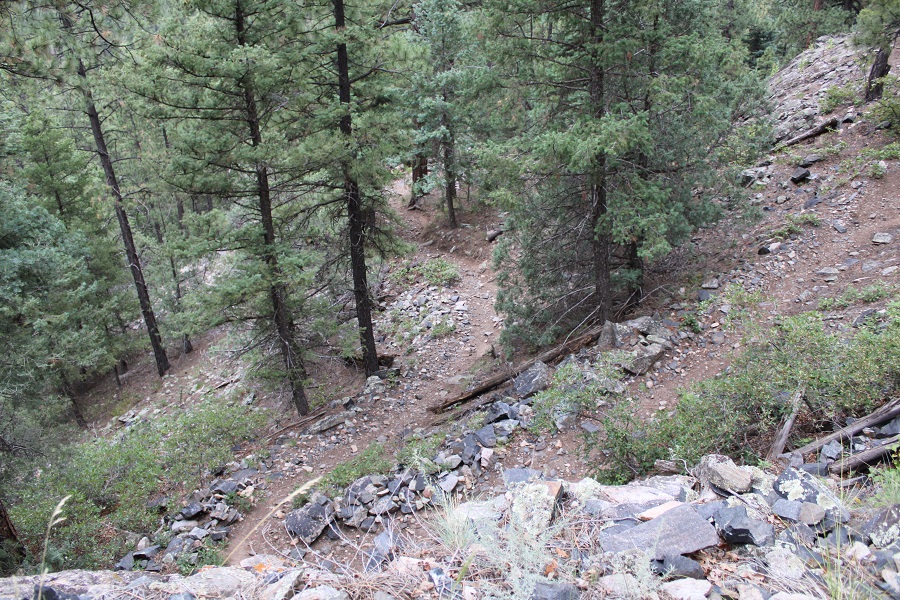 Another fun part: after gaining and gaining and gaining in elevation, at around 10,330’ you’ll LOSE about 200’ of elevation, quite quickly. Pictures looking down don’t do it justice, so here’s LOOKING BACK UP at the elevation you’ll lose