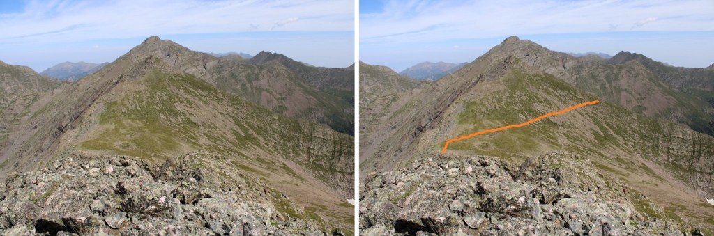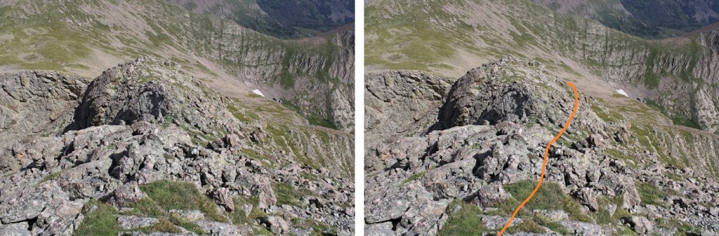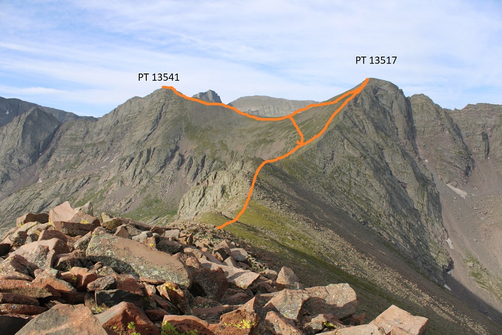 The trek over to 13541 was straightforward, and a simple ridge hike until the last bit or so (circled in red)