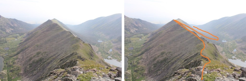 Most of this ridge to PT 13541 is just a tundra hike, until the end, where it becomes rocky and there are some steep drop offs to avoid. Here’s an overall view of the route: A little more than half way up the ridge I left the ridge and skirted the mountain to the left to head towards the summit