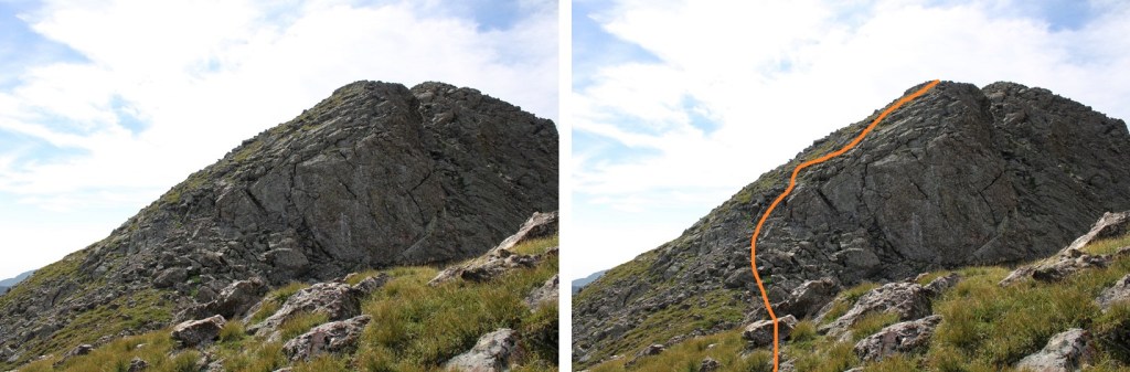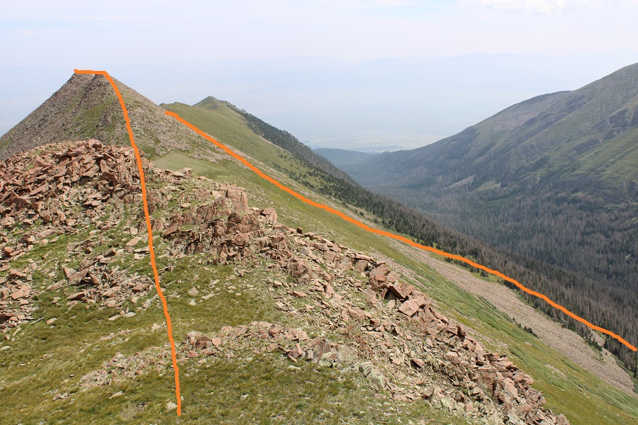 You can stay on top of the ridge the entire time, or dip down to the right. The summit is in the middle of this short ridge