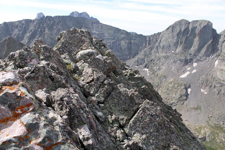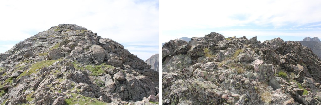 The ridge was mostly tundra, but became rocky at the end. All of the rock above treeline feels like Crestone rock: conglomerate with lots of hand holds. The only difference is these are rocks, and not slabs. This stays class 2