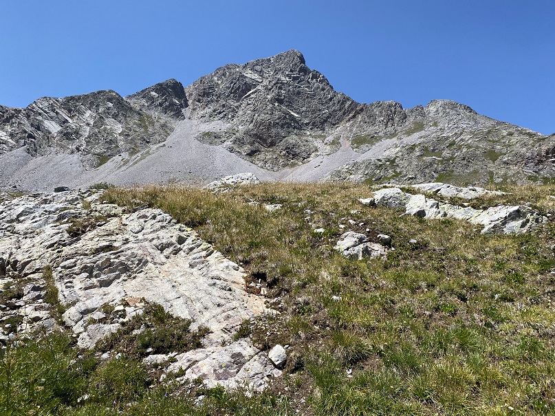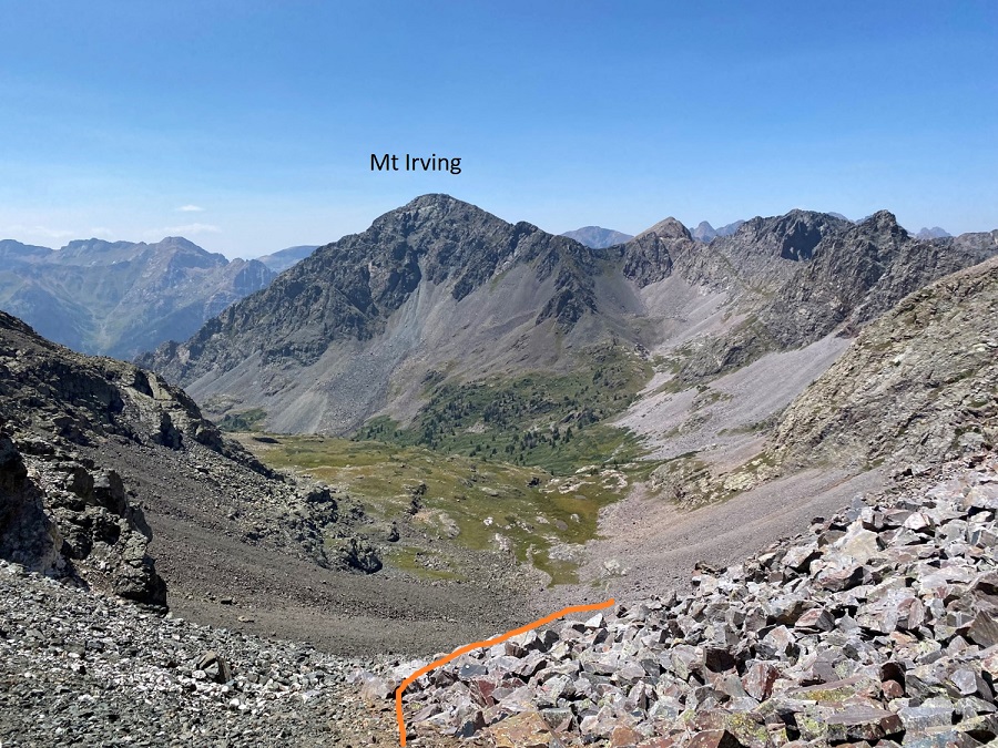 Once at the top of the gully/saddle, it was once again time to lose elevation.  Being here also gave me a great view of Mt Irving.  I descended the gully to the northwest, staying on the scree at the base of the rock outcroppings, rounding them, and losing 175’ in elevation.