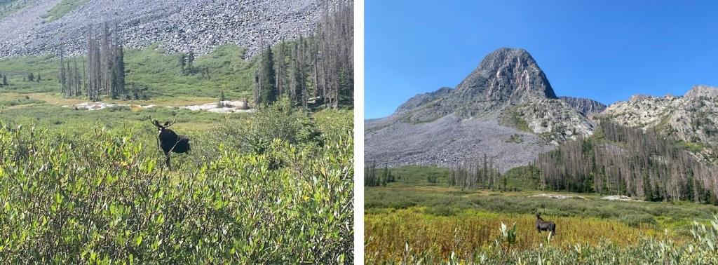 On my way out of the basin I decided not to take any chances, and wore my helmet. Towards the end of the basin I spotted the moose again. This time he had a friend, and didn’t seem to care I was there. I’ve seen over 20 moose in Colorado while hiking, and this was the first aggressive one I’ve come across. It’s interesting today he had no interest in me, while yesterday he was overly intrigued/agitated I was there.