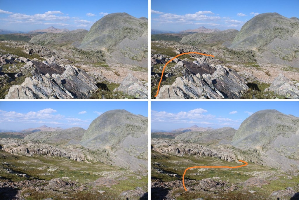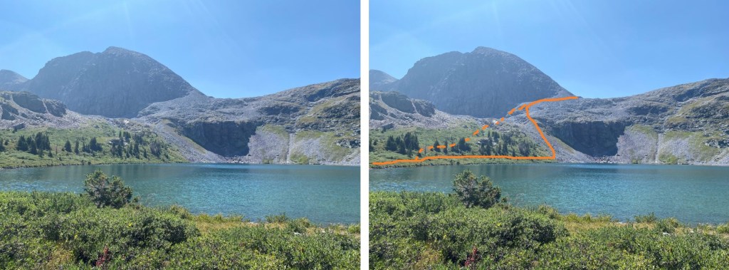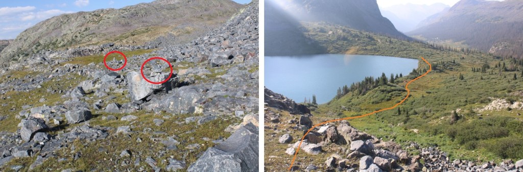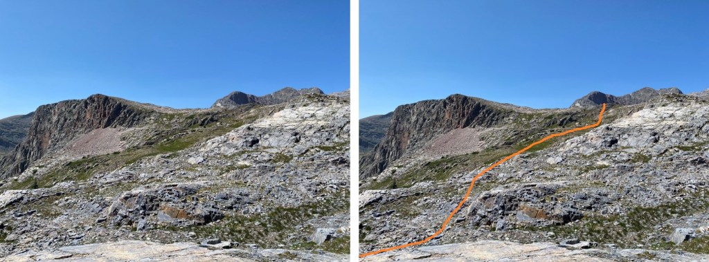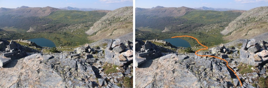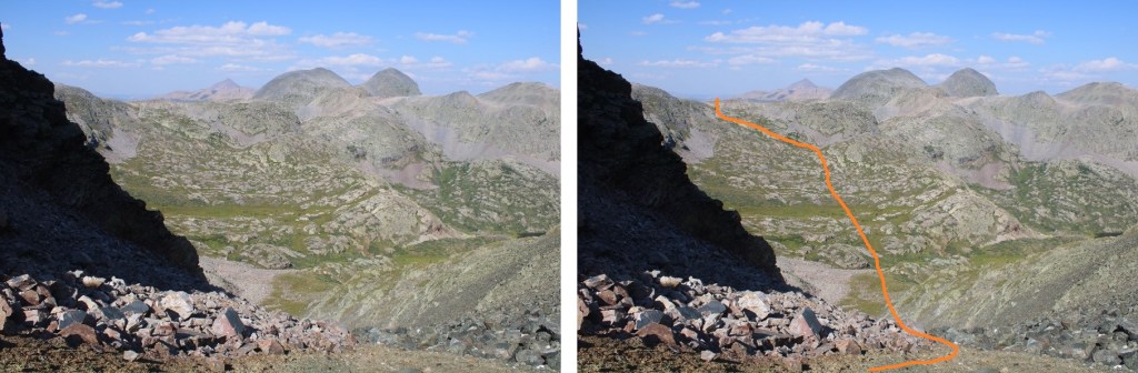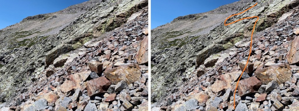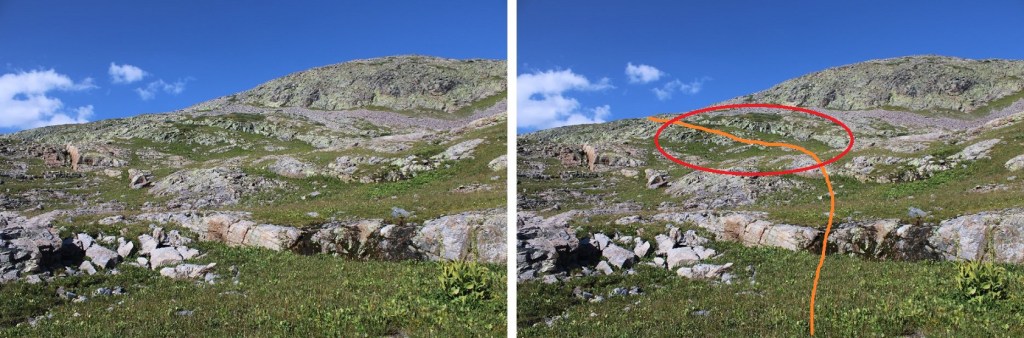 As I made it to the rocky area, I came across a cairned trail, and followed that trail southwest.  Note, I took the solid line up, the dotted line down. The dotted line was easier, but both ‘went’.  You can’t tell from below, but there’s a grassy area by the dotted line that helped me avoid the willows (pictures on my way down).