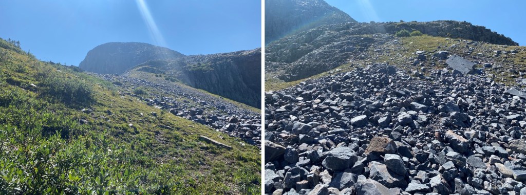 The basin was easy to cross. There were small streams and some willows to navigate, but the route was obvious (and choose your own adventure:  just keep heading towards the gully/saddle). The gully was a mix of large, loose boulders, smaller loose rocks, and scree.