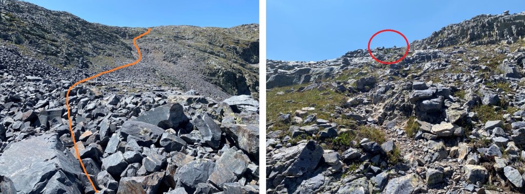 Here’s the cairned route, with the ‘exit cairns’ circled in red