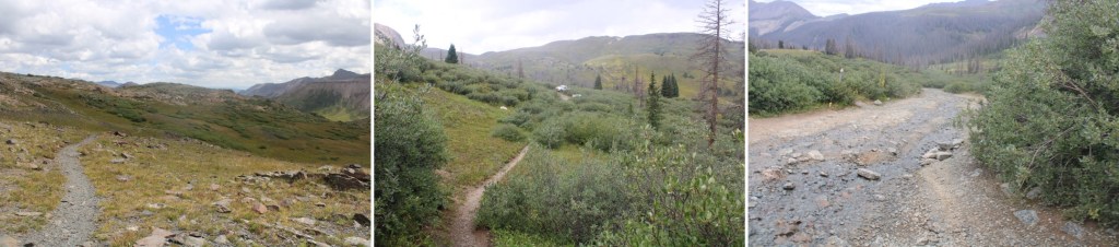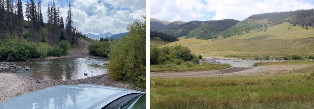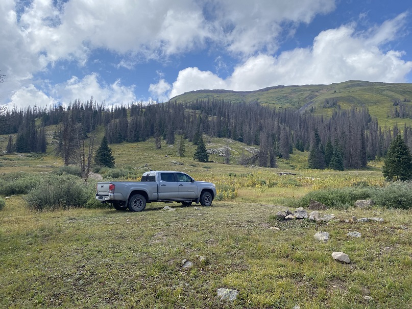 I’ve been to this area 3 or 4 times, and know the perfect place to park:  It’s a pullout at 11230’, just before you hit the trees (again), and before getting to Beartown.  My truck can make it further, but from past experience I know it’s going to get Colorado pinstripes from the willows and I have the opportunity to scrape the frame a couple of times as well. I love my truck, so I parked here, about 1.3 miles from the trailhead, in a flat spot with a campfire ring at 11235’.