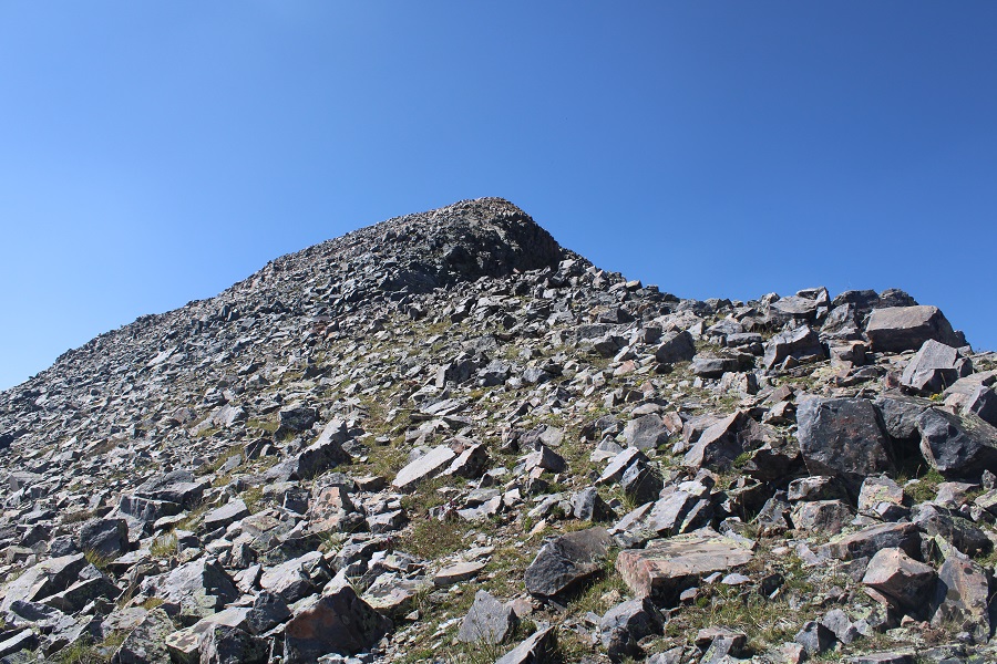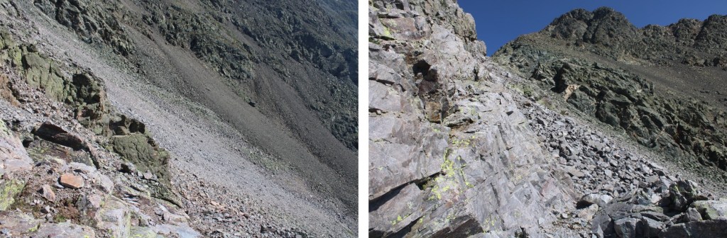 Once across the green rock outcropping, it was time to gain the ridge.  I turned and headed north.  The rocks here were large and loose, with some scree mixed in.