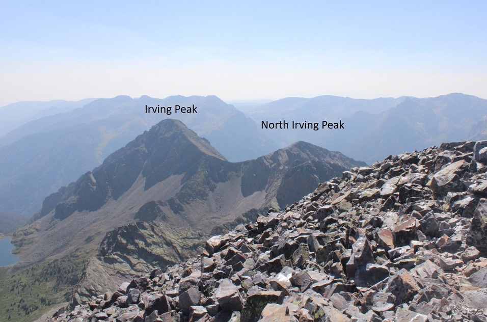 I looked over at Irving and North Irving.  I did the math in my head, and there was no way I had time to loose the 1500’ of elevation, then regain 1300’ to summit Irving, plus hike back with all those ups and downs to Rock Lake before sunset.  It’s important I’m in my sleeping bag before the sun goes down, which limits my hiking time. Oh well, just one peak for this trip.