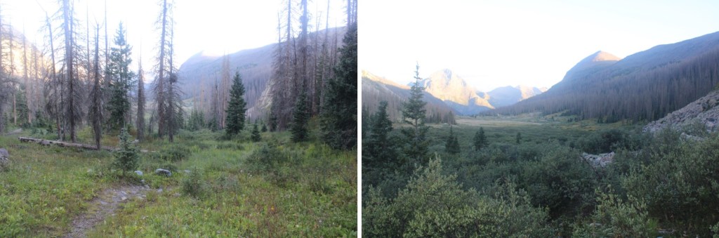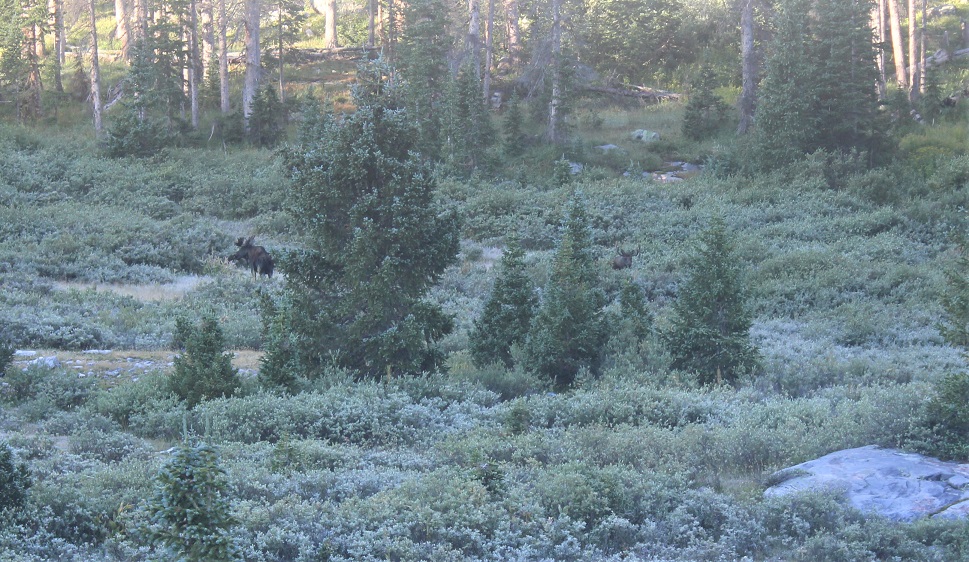 In this basin was a bull moose.  I didn’t worry too much about him, because he was hundreds of yards away from me, on the opposite side of the basin.  I continued on the trail, but once he noticed me, he raced towards me and stopped a few yards away. He charged me (it was a bluff). I knew not to make eye contact with him, which was what he wanted. I could actually feel him willing me to look at him.  I kept my head straight and walked the trail with a purpose, ignoring him.  He continued snorting and pawing at the ground and shifting his head from side to side. Then he paralleled me for about 50 yards, walking about 5 yards to the west of me. When he was done, he trotted away and took in a view of the mountains.