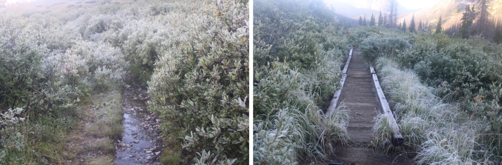 I made it back to my campsite as the wind started picking up.  I was glad I’d made the decision to head back.  I jotted down some notes, and looked at my tracker:  I’d done 18 miles today, with almost 7500’ of elevation. I sat in my tent for a while, glad I’d decided to bring a tent, listening to the wind howl outside.  I eventually fell asleep, and woke up to frost inside my tent. Lovely.  I quicky broke camp and headed back down into the basin.  Everything was covered in a thinl layer of frost.