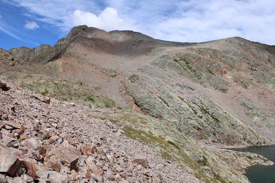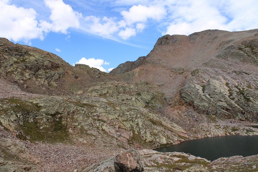 You can’t see it in this picture, but the lake is to the lower right. To get there, I skirted the rocks high, just below the strip of tundra, and made my way to a gully runout below Peak 5, following that to the lake.