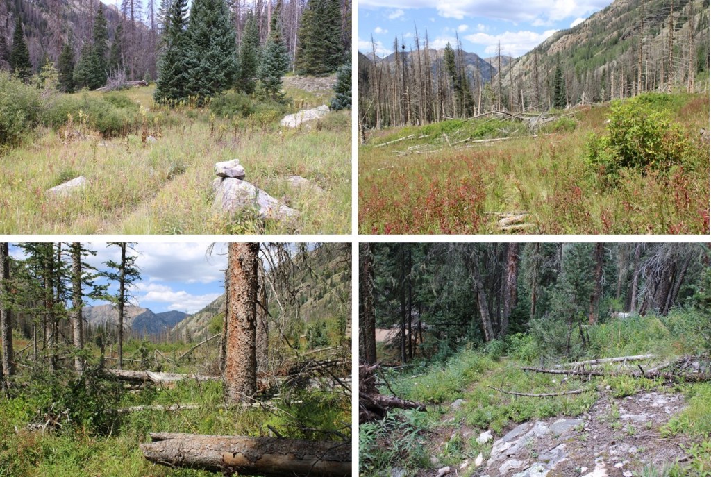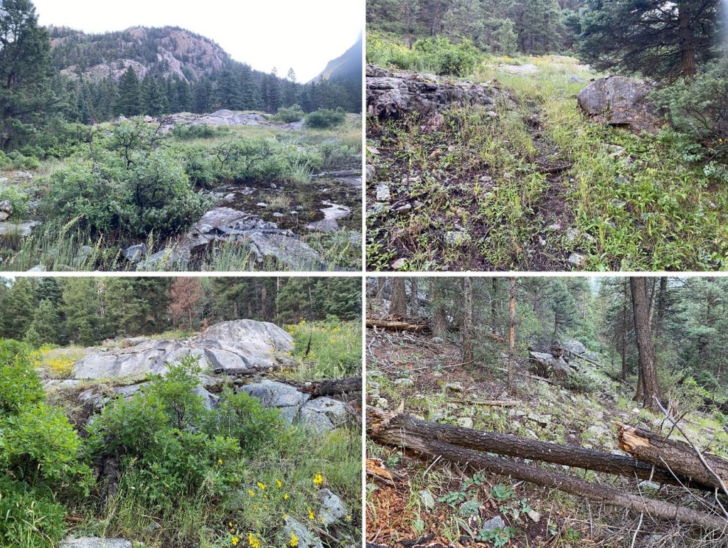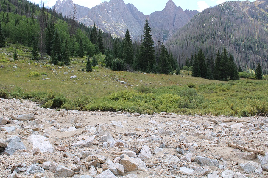 About halfway to the basin on this trail I came across the avalanche debris from a few years ago. I’m sad to say, there still isn’t much of a trail through this stretch. However, if you find a game trail, follow it! The trail parallels Noname Creek, and to follow this ‘trail’ properly you’ll need to stay further north than would seem intuitive of the creek (don’t cross the creek, always stay on its north side). This is what the avy debris looks like: it’s overgrown, so look for game trails. Note: watch your step, as the grass/flowers here are taller than the debris and you could easily find your ankle stuck between the logs, but there is a defined trail of tromped down grasses if you can find where it begins.