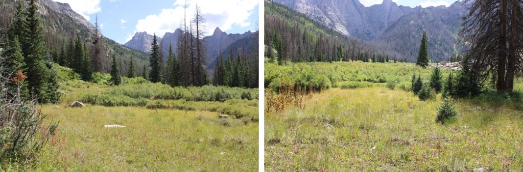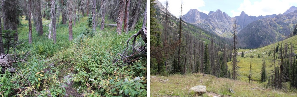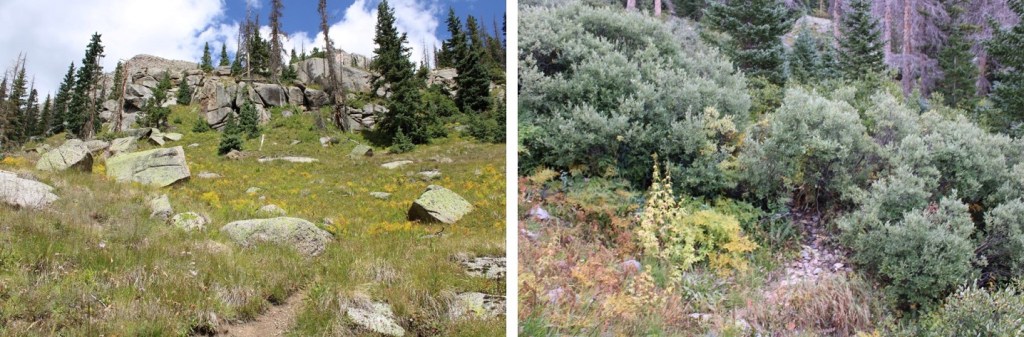 My 20 minute break over, I continued following the basin east. Willows are involved here, but the trail is much easier to follow.