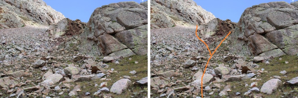 Once in the upper basin I messed up a bit, as you can probably see by my GPX track at the bottom of this post. I didn’t go with my gut instinct, and instead went with a GPX file I had. I didn’t realize until later it was a hand drawn GPX file. (Side note, it should be REQUIRED for you to post you hand drew the file if you’re going to make it available for download: I was smart enough to turn around, but not everyone would have made the same choice). In any event, here’s the path you should take to Lake 12,522, both routes work and stay at class 2: