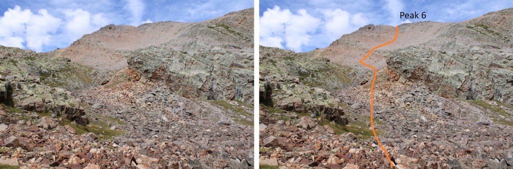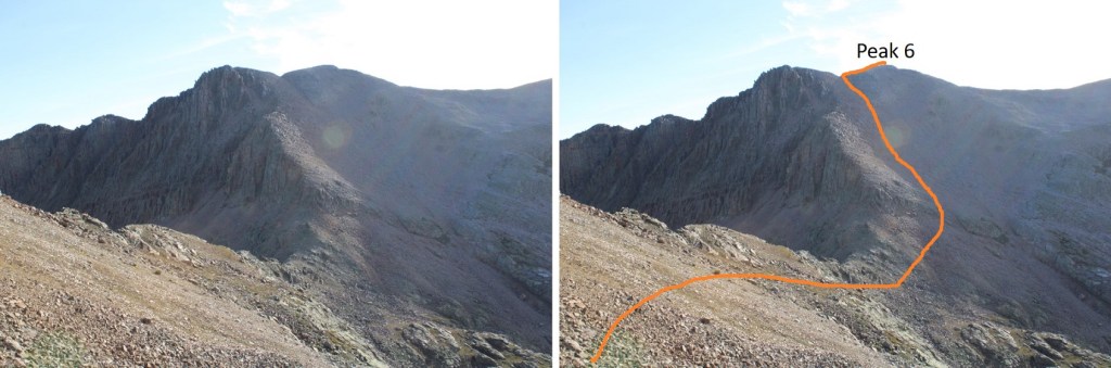 I was up at first light the next morning. To summit Peak 6, I headed northeast from my campsite, following the scree. Here’s an overall view of my route