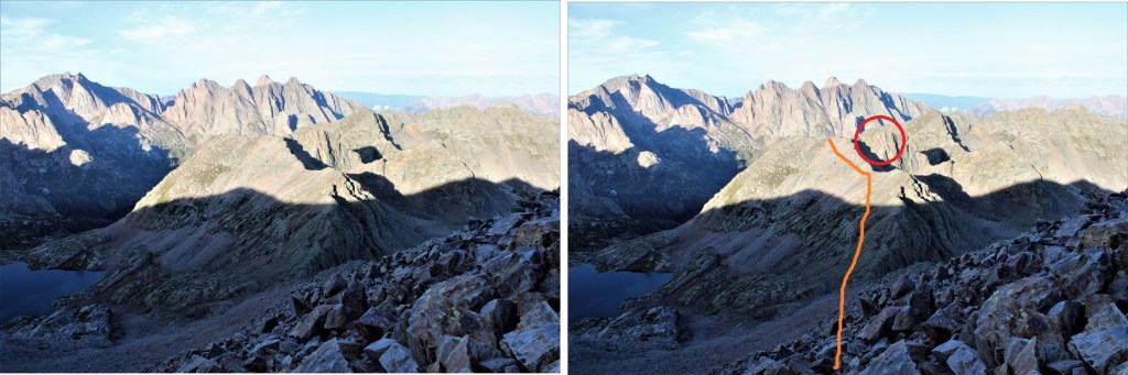 It would be hard to cliff out here, but you should get a good idea of your intended route from below before you start out for your peaks. Here’s what my route looked like from the lake, down from Peak 5 (you could also take this route in reverse, ascending this way)
