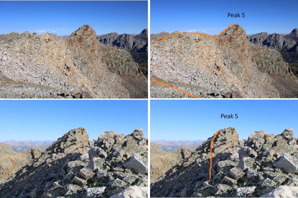 I intended to summit Peak 5 today as well, but was having trouble… seeing it? For reference, here’s Peak 5 as seen from Peak 6, along with my route. Peak 5 is circled in red