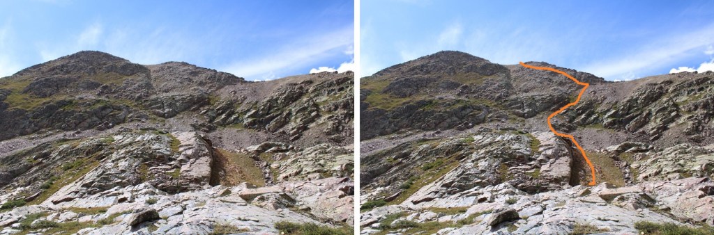 And some step by step pictures. There was scree here, and the rocks were steep, but I felt the entire route was class 2. I stayed close to the rock outcropping in the upper gully, and I saw a swift moving pine marten near the upper ridge.