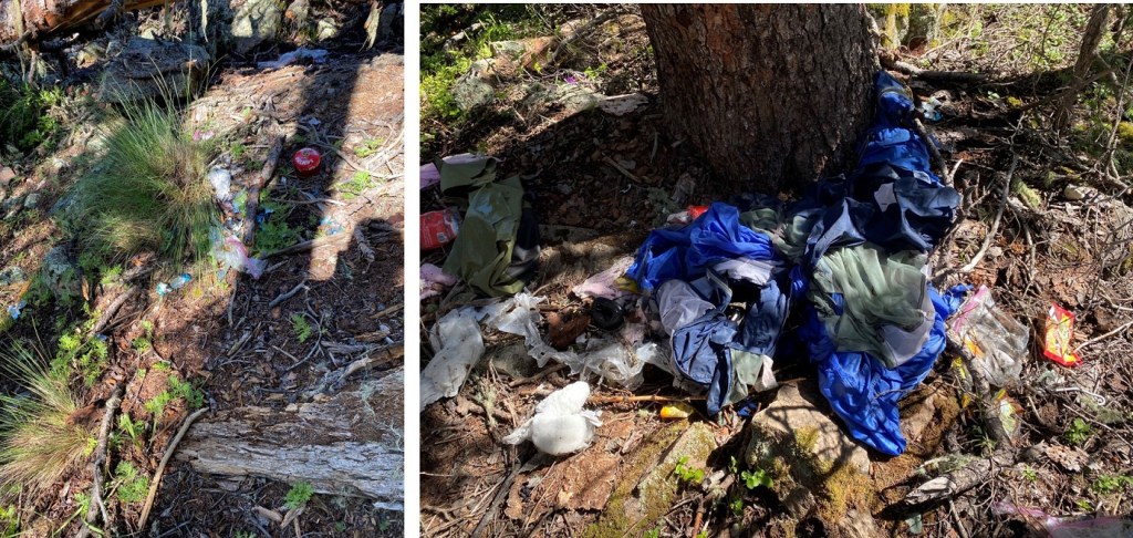 Final side note: Just before getting to Jagged Cabin, on top of a hill but paralleling Noname Creek on an obvious game trail, I found what looked to be a recent cache torn open and destroyed by critters. I’m not sure if someone left this to be used later this summer, if they ‘forgot’ their gear, or if they left it after finding it ruined, but it’s all destroyed and useless at this point. It’s also trash. There’s a full tent that looked like it had been stored properly (torn to pieces now, of course), tons of food wrappers (like, at least 10 different wrappers from Ramen, and lots of snacks: it was a ton of food at some point, but diminished to empty wrappers now), a small radio, a destroyed first aid kit, an Ursack that had been ripped into pieces, etc. I took what I could, but there was a lot to carry out. Maybe if everyone took a little bit we could clean the area up?