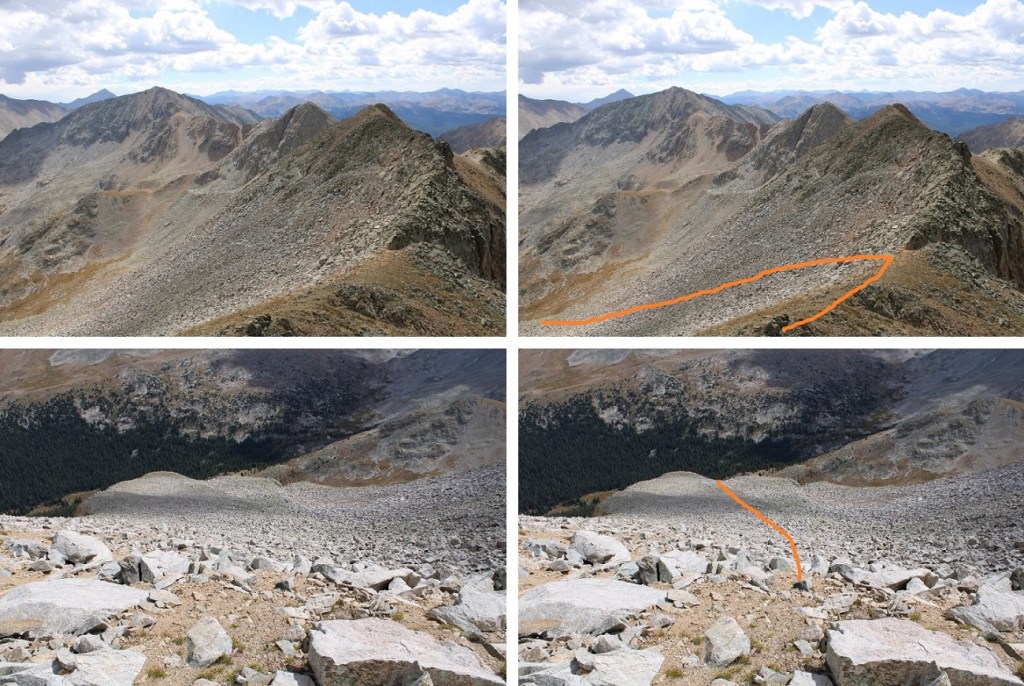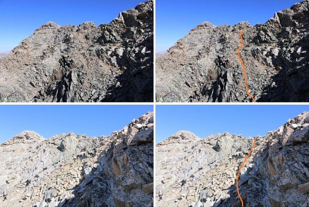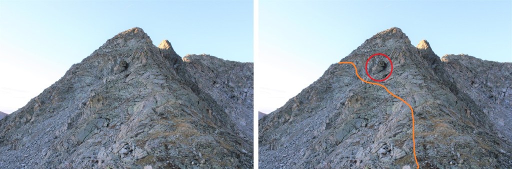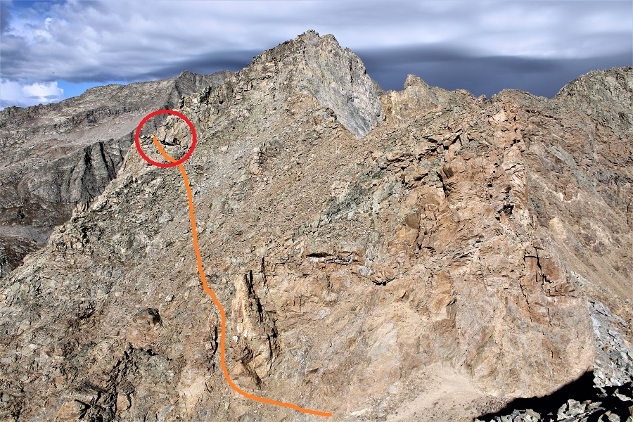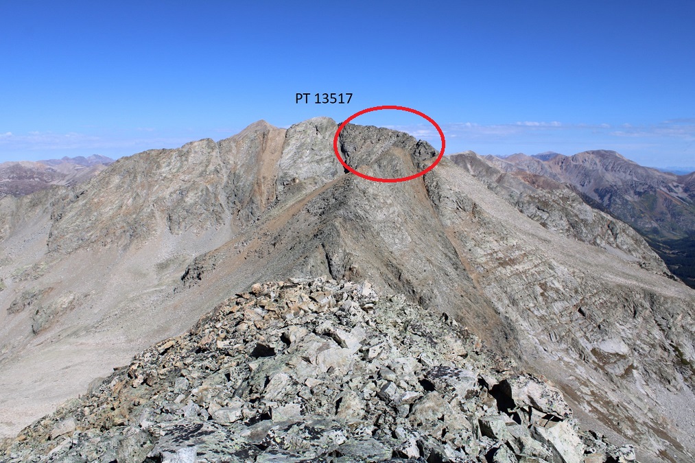 Ok, down the ridge to the Pear Peak/PT 13220 saddle.  It’s all class 2, and you’re aiming for a scree filled gully, circled in red