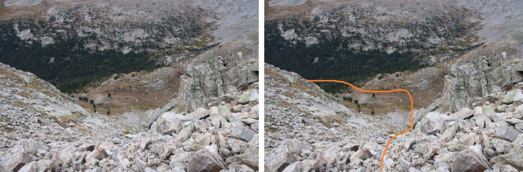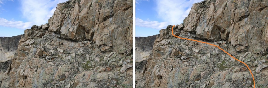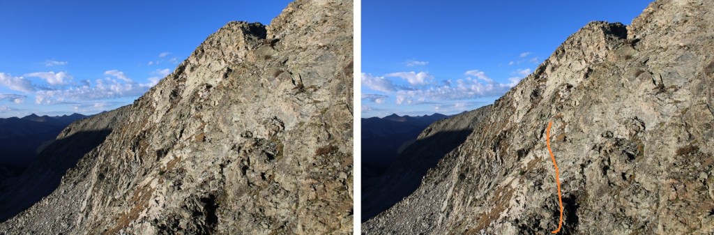 Here’s the view and my route from the first big gully. I stayed level to get across the chossy gullies. It’s harder/steeper than it looks.