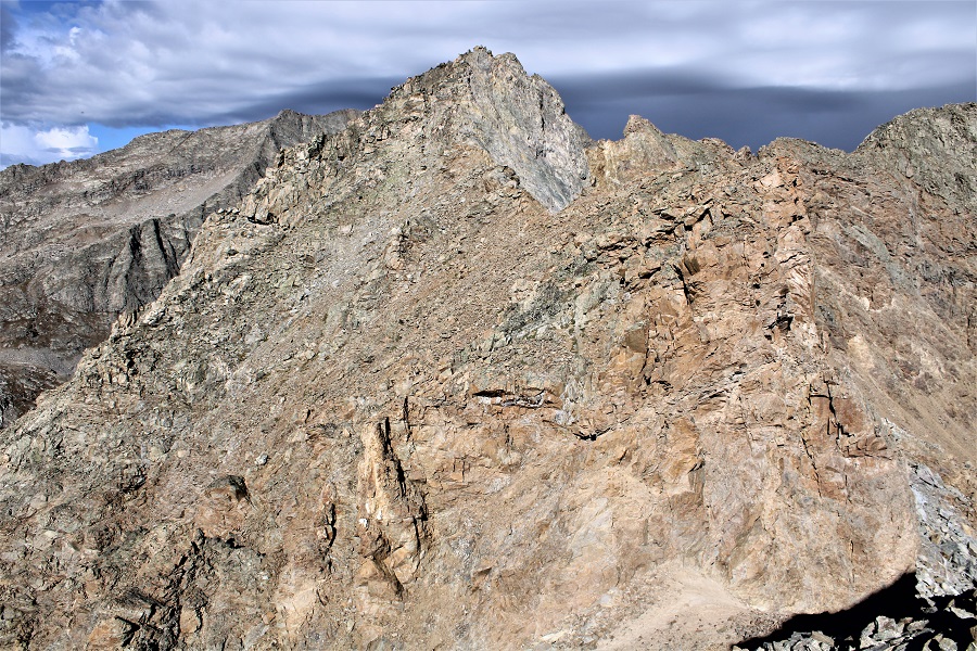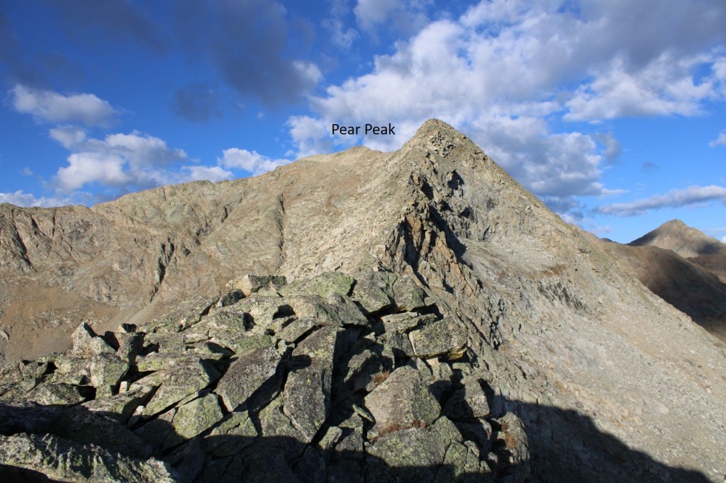 From this point on, the ridge ‘goes’.  It’s mostly on large, solid rock, but remember, these rocks can move. It’s about three quarters of a mile from here to the summit of Pear Peak.  The ridge felt consistent class 2-3. I didn’t feel there were any class 4 moves on this ridge.
