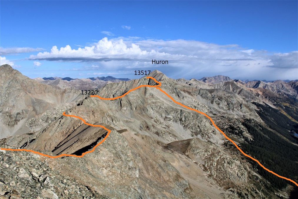 Here’s an overview of the rest of my route, mostly following the ridge, except for a short area on the way to 13220 where I stayed left (more on this later).  You also have a good view of the decent route from here. Now’s a good time to study it.