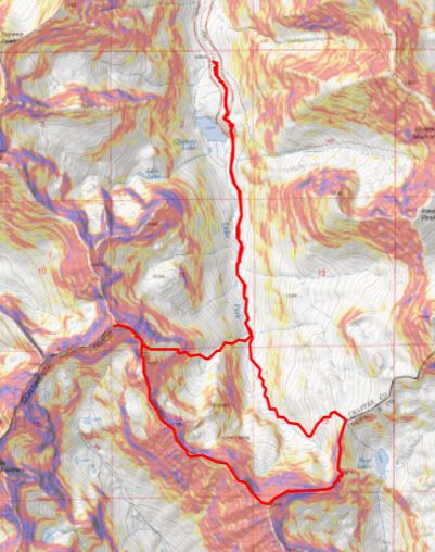 The hike out was uneventful, except it rained.  I know it looks like it was a beautiful day, but in reality, just before PT 13220 it was snowing, and it rained/hailed/graupeled a bit on my way down. There were also people fishing at Clohsey Lake who had a few dogs. I was about 100 yards from them, but their dog wouldn’t stop barking at me.  I’m sure that made for wonderful fishing.