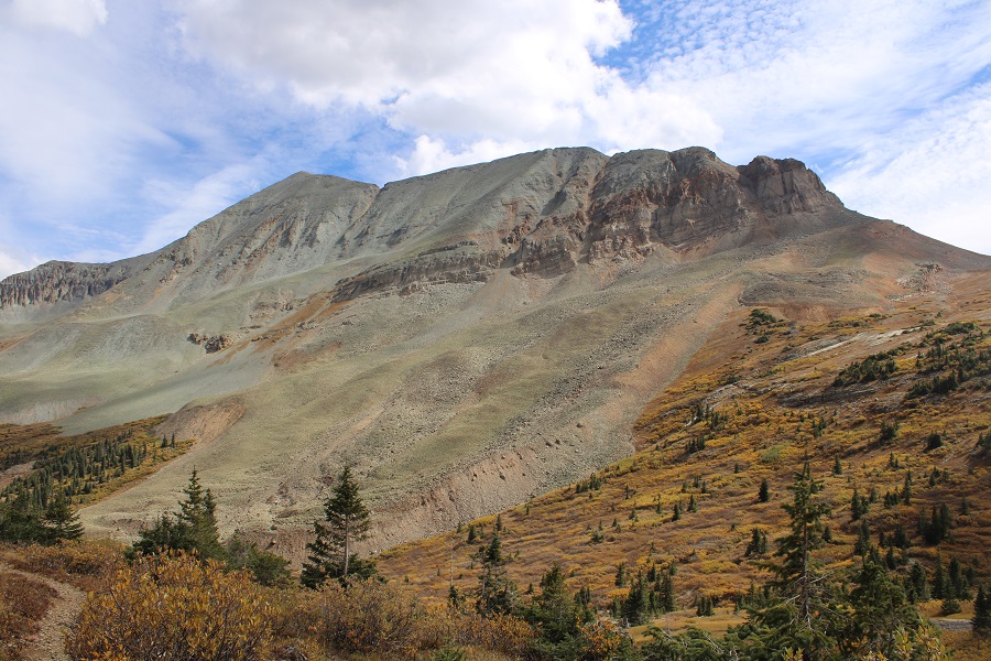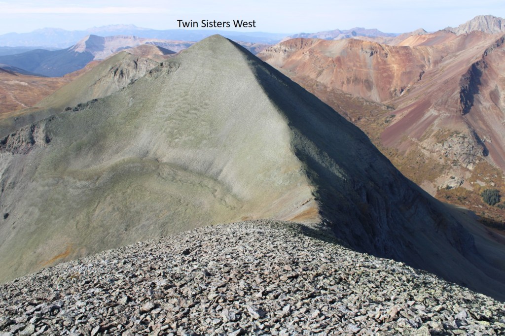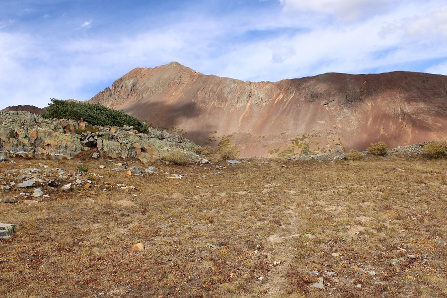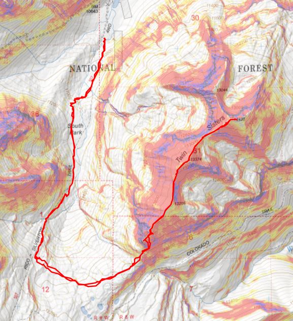 I hiked the Rico-Silverton Trail for 2.2 miles, to about 11925’, and then left the trail to follow the contour of the upper basin east, towards the south side of Twin Sisters. This is the route I took