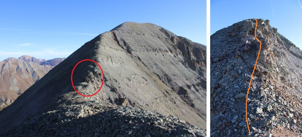 Hitting the false summit was a bit of a downer, but the hike had been easy thus far, so it was kind of expected. I continued following the ridge. There’s a quick chasm to cross in the circled area. It can be kept at 2+. I dipped down to the left about 30 feet, then re-ascended and started climbing towards the summit
