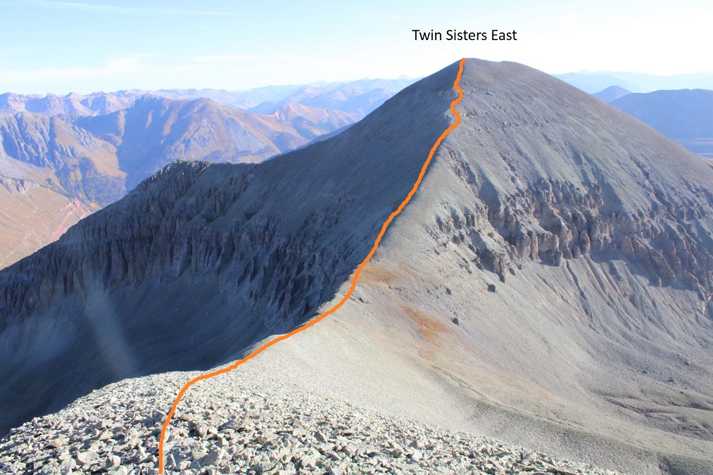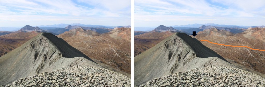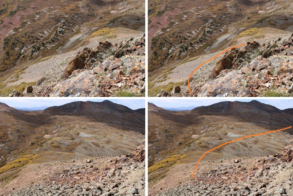 From Twin Sisters West I continued following the ridge southwest. It’s important to follow this ridge all the way to the end (black arrow). Also, here’s an overview of the route around the basin. Fun fact: the white area isn’t water, but rock from a dry stream bed. I’m sure at some point in the year it holds water, but I’ve only seen it dry.
