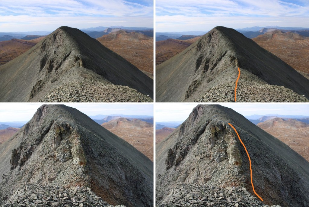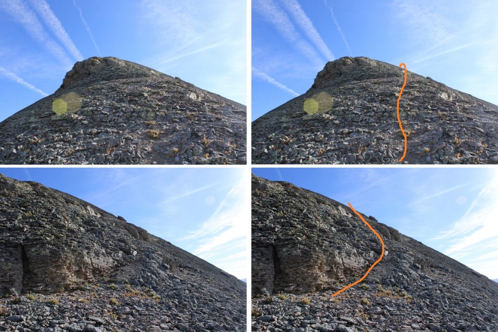 There were no big surprises on this one. There were some game trails to the right, but they didn’t seem prudent. I just followed the ridge, and then closely navigated the rock problems, which were all class 2. This is the route I took