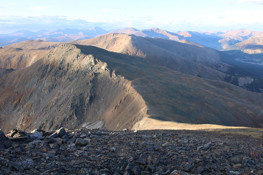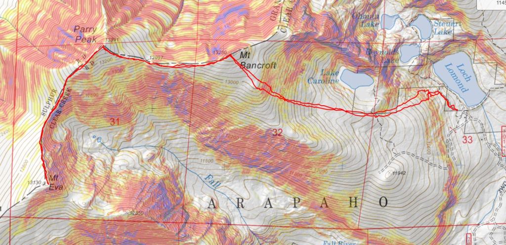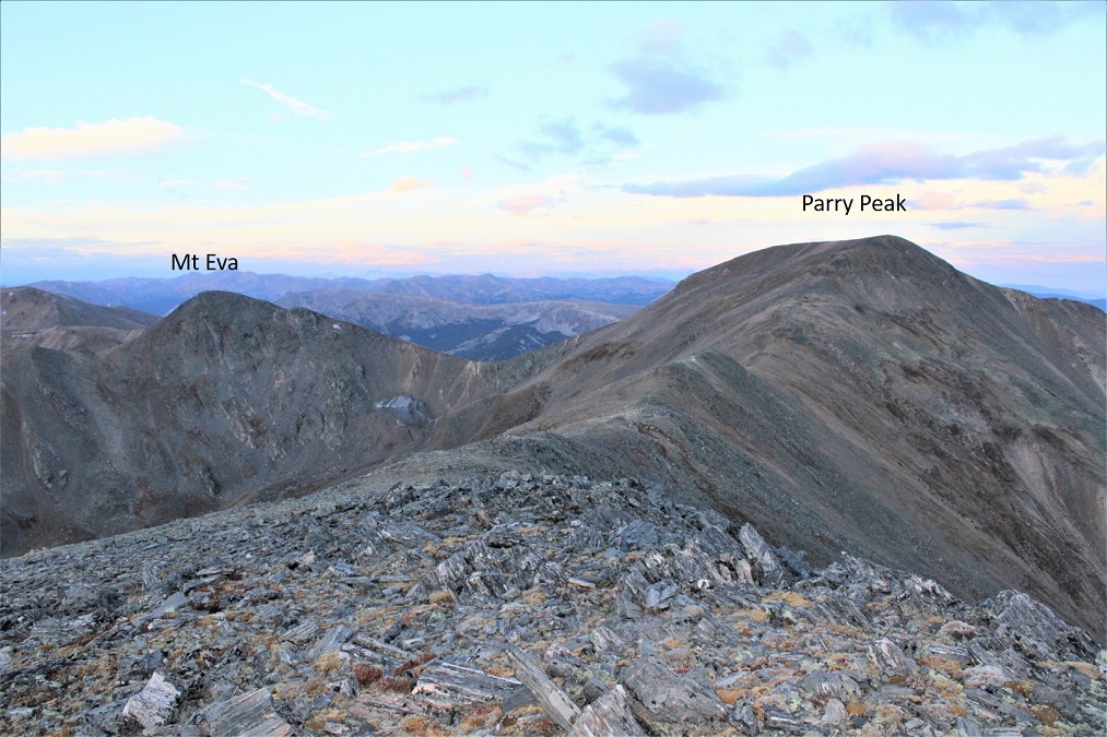 Today felt really laidback: it was easy to cruise along the ridgeline, without any major obstacles keeping me from slowing down. Here’s looking back at Parry Peak and Mt Bancroft from Mt Eva