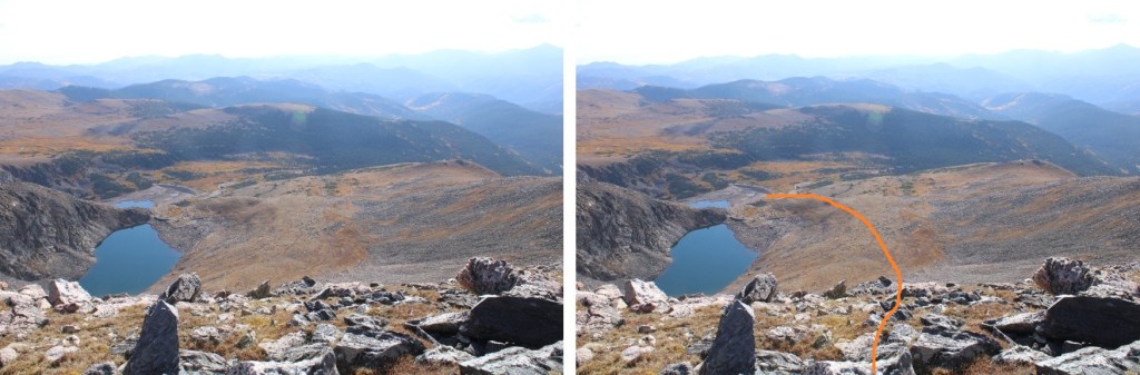 Once un the upper basin, I kept Lake Caroline to my right and gained the ridge. This can be done any number of ways, Here’s my route: