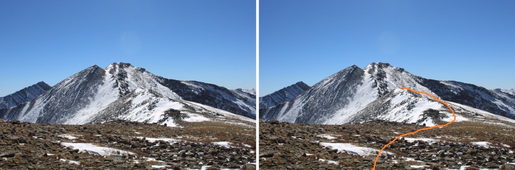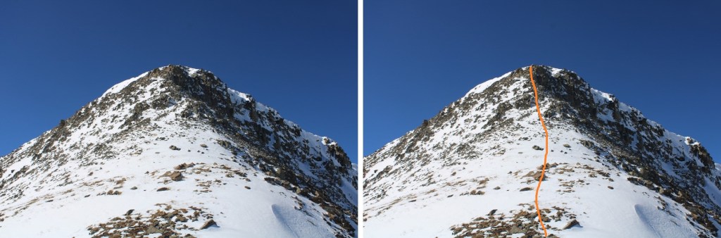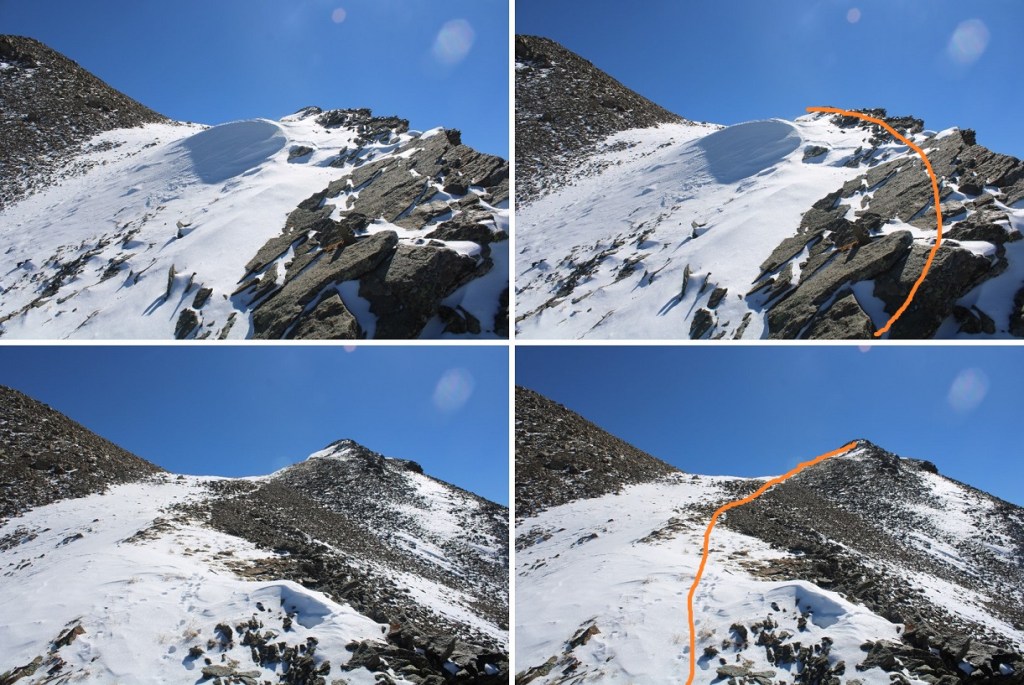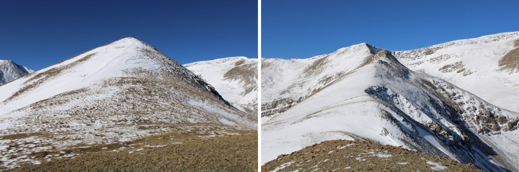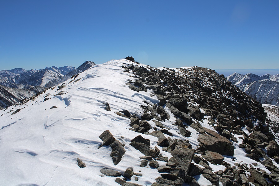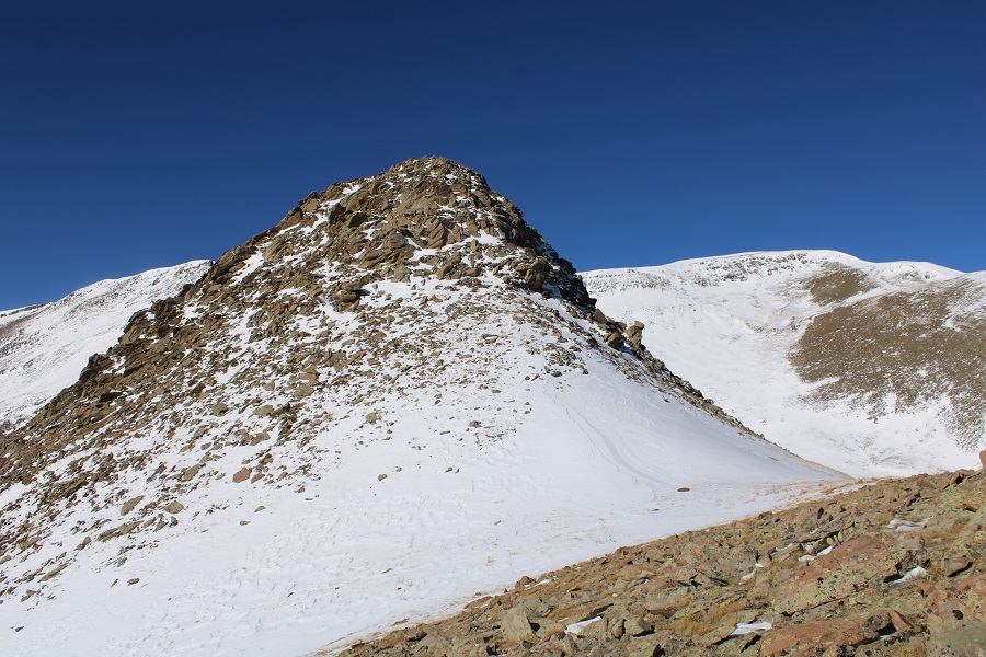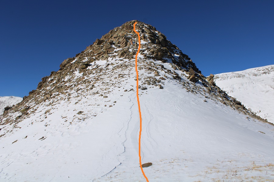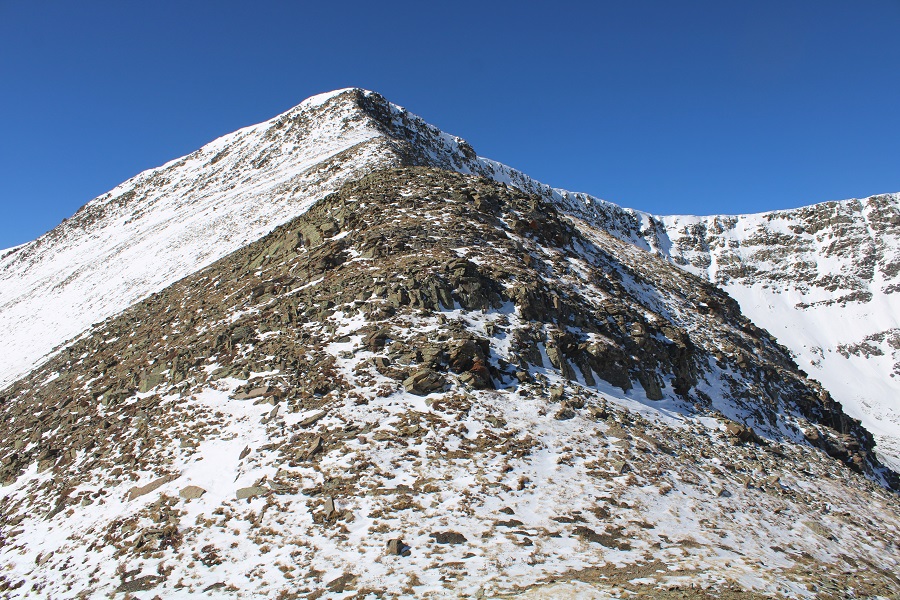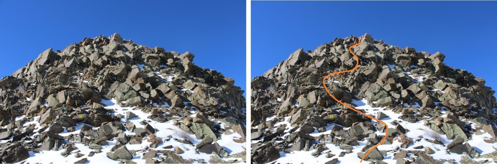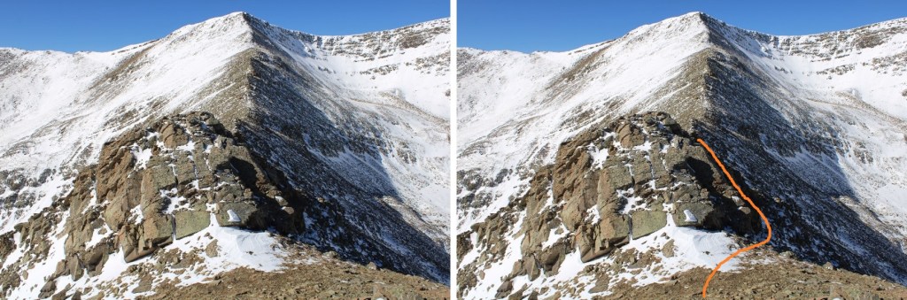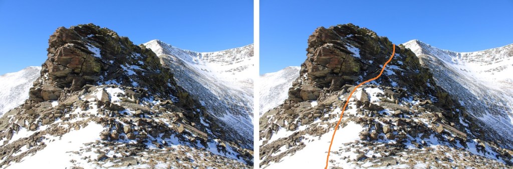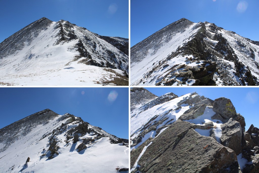 I made it to the saddle, and picked my route. By sticking to the very top of the ridge I was able to keep this class 3, although there were some tricky moves with the snow. Here’s the route I took