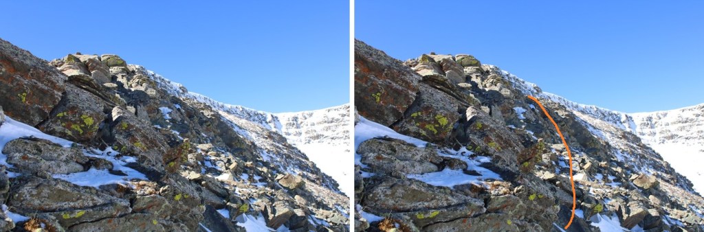 I went straight up and over this, using snowshoes in the beginning, and then taking them off to scramble up the rock.