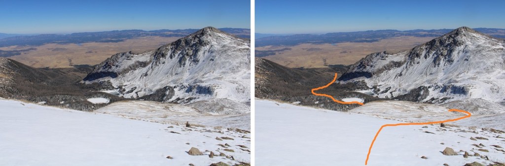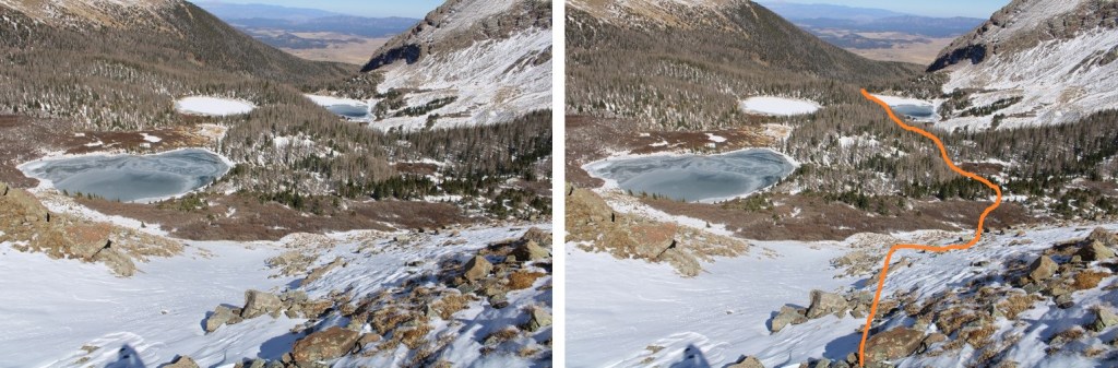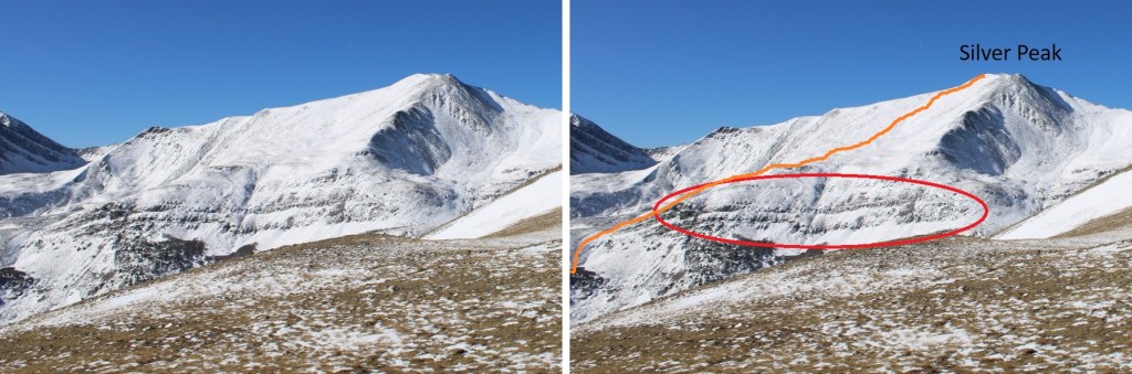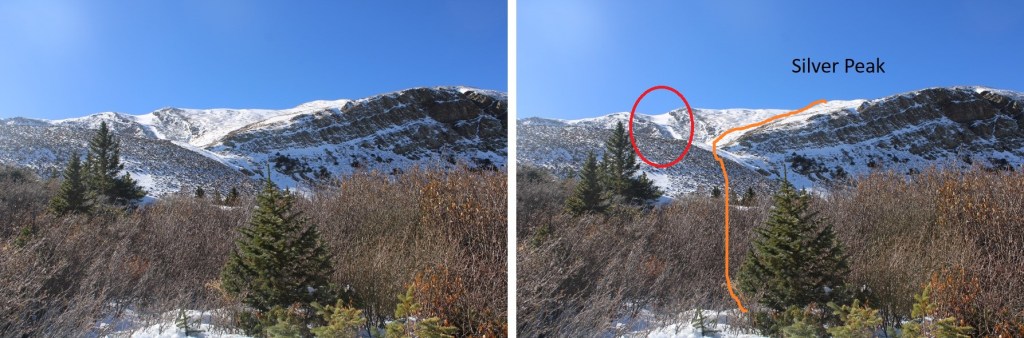 Here’s looking back at how I came down from Silver Peak.  The top of the avalanche area is circled in red, and flows all the way to the lakes