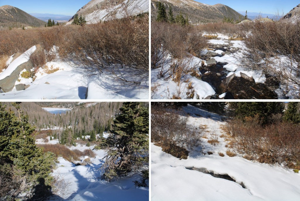 Please note:  I’ll show you how I made it down to the Lakes of the Clouds, but I do NOT recommend this as a winter/winter conditions route, and it’s probably not ideal in summer either.  There was snow in the top of the avalanche chute, and it was mid-October.  The gullies were unstable and difficult to navigate while covered in snow, and it was hard to find a direct route down.  The only positive was the creeks were low, so I was able to walk directly in them to avoid the willows.  (Willows:  another reason to avoid this route, just go back and take the ridge down).