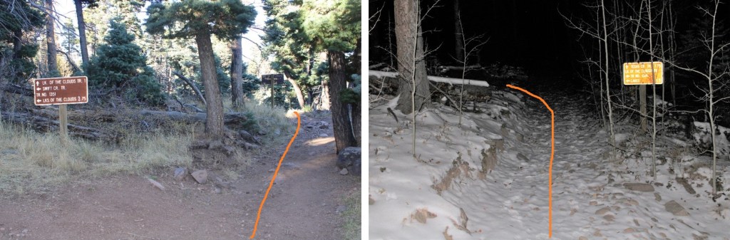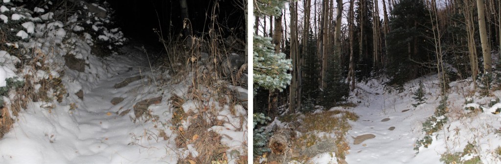 There was now snow on the trail.  It was still dark, and I could hear an owl hooting in the trees. I saw lots of rabbit tracks, and some elk tracks as well.  Mine were the first footprints. I continued following trail 1349 as it switchbacked up the mountainside.