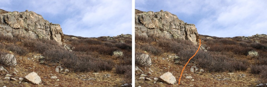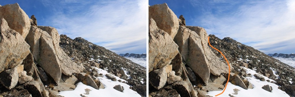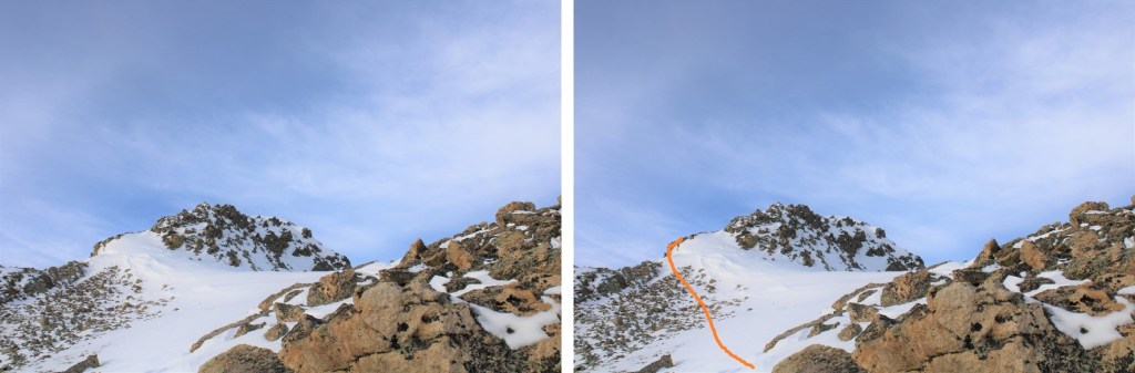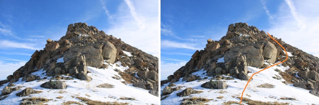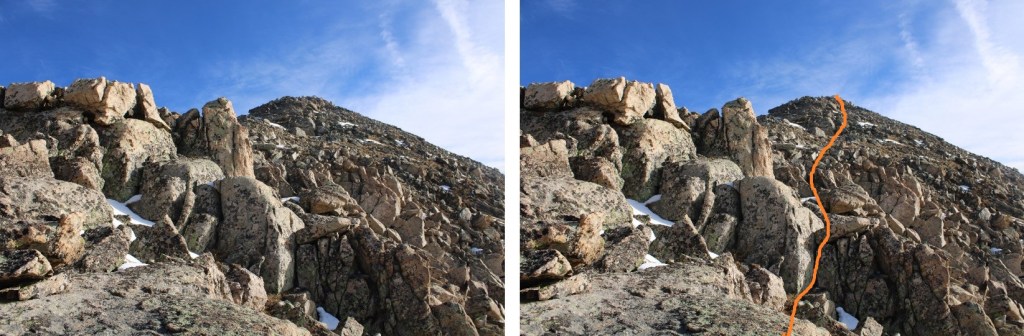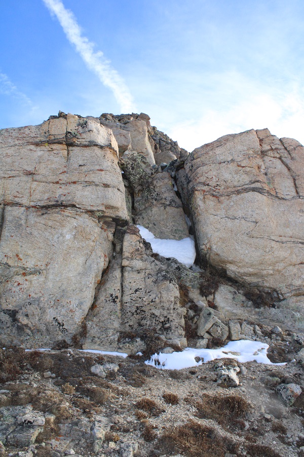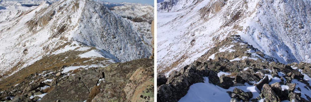 This ridge is mainly class 2, with a few class 3 moves sprinkled in. The class 3 moves probably could have been avoided, if there hadn’t been snow. Here are some pictures of the route
