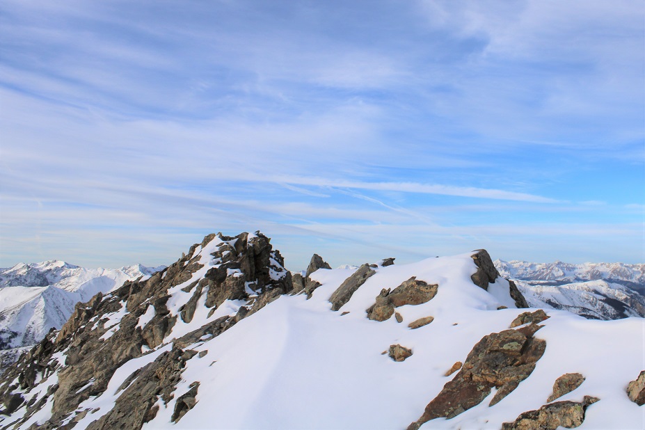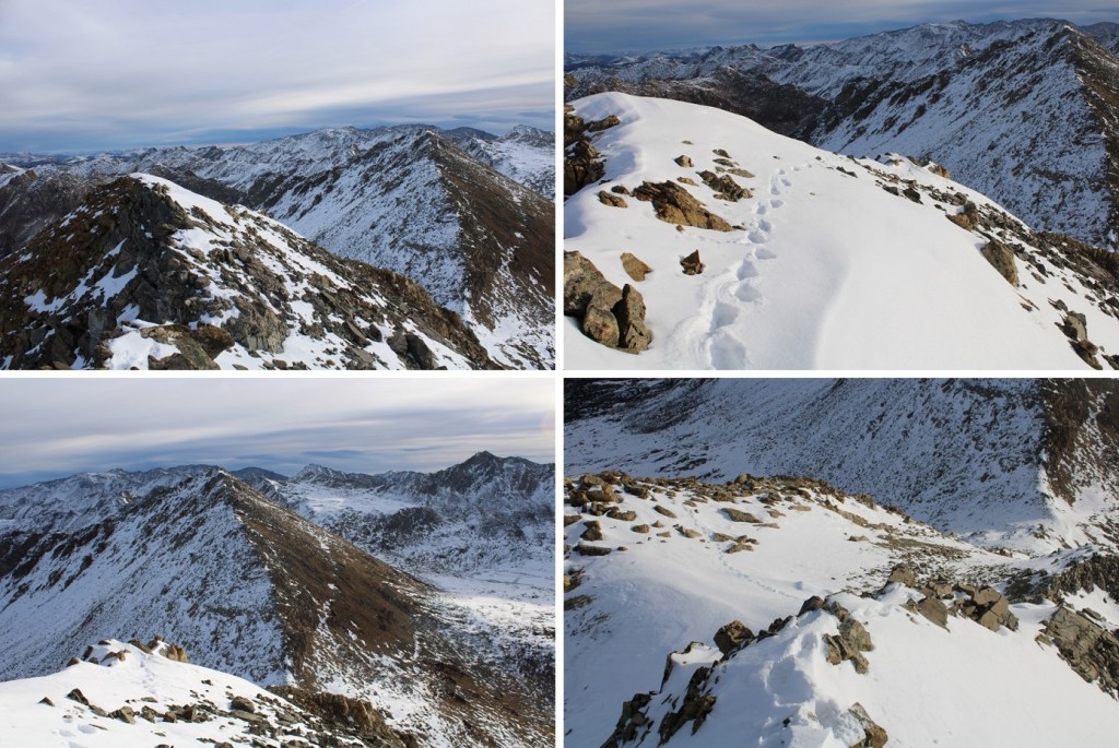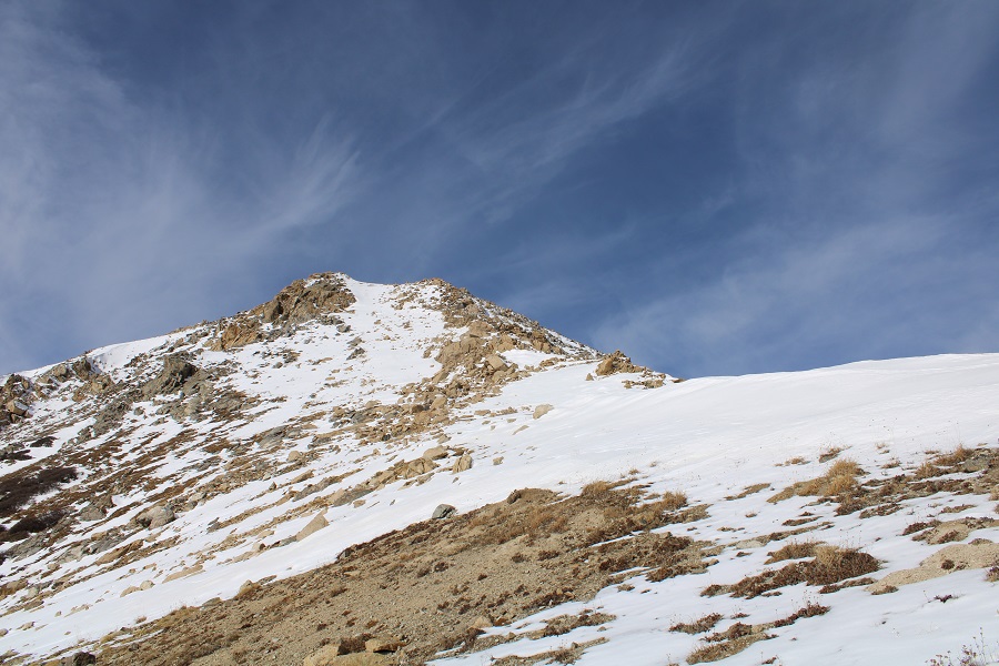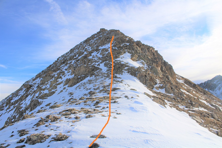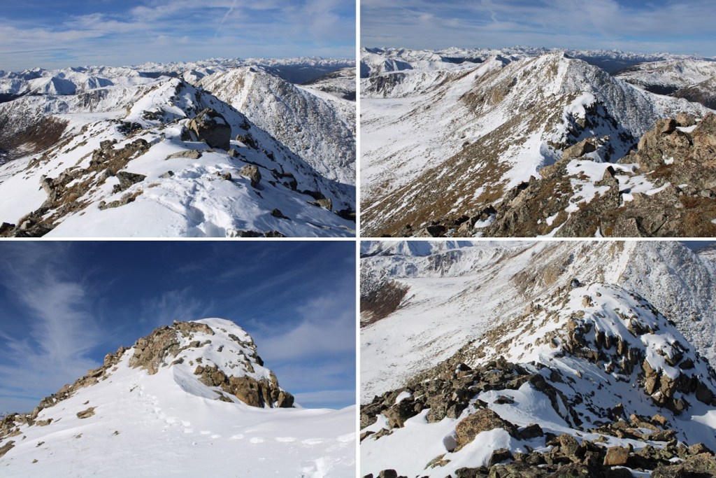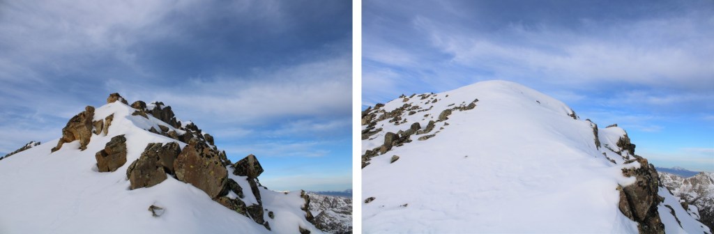 I would have liked to have taken the gully to the summit, but the snow as sugary and unconsolidated, and above my waist in places, making my ice axe and spikes useless, so I took the ridge. This posed its own set of challenges, as the snow on the ridge was either covering the rocks, or covering the voids. It was “choose your own adventure” to find out which. There was some class 3 scrambling here, but I was able to take the ridge proper.