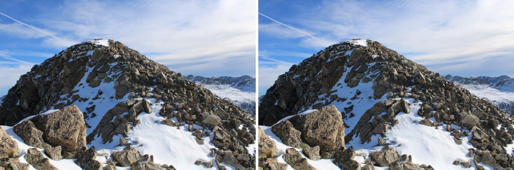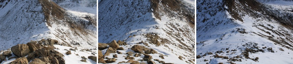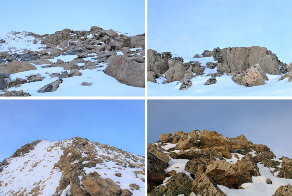 I dropped my gear and just brought my camera with me, climbing over the snow and then hand-over-fisting it on the rocks to the actual summit. This was class 3 with some exposure. I didn’t take the snow because it was an unconsolidated drift, with a lot of voids to twist an ankle, sink up to my chest, or worse
