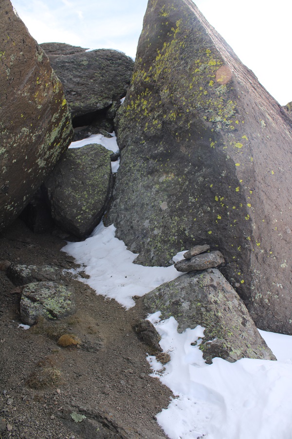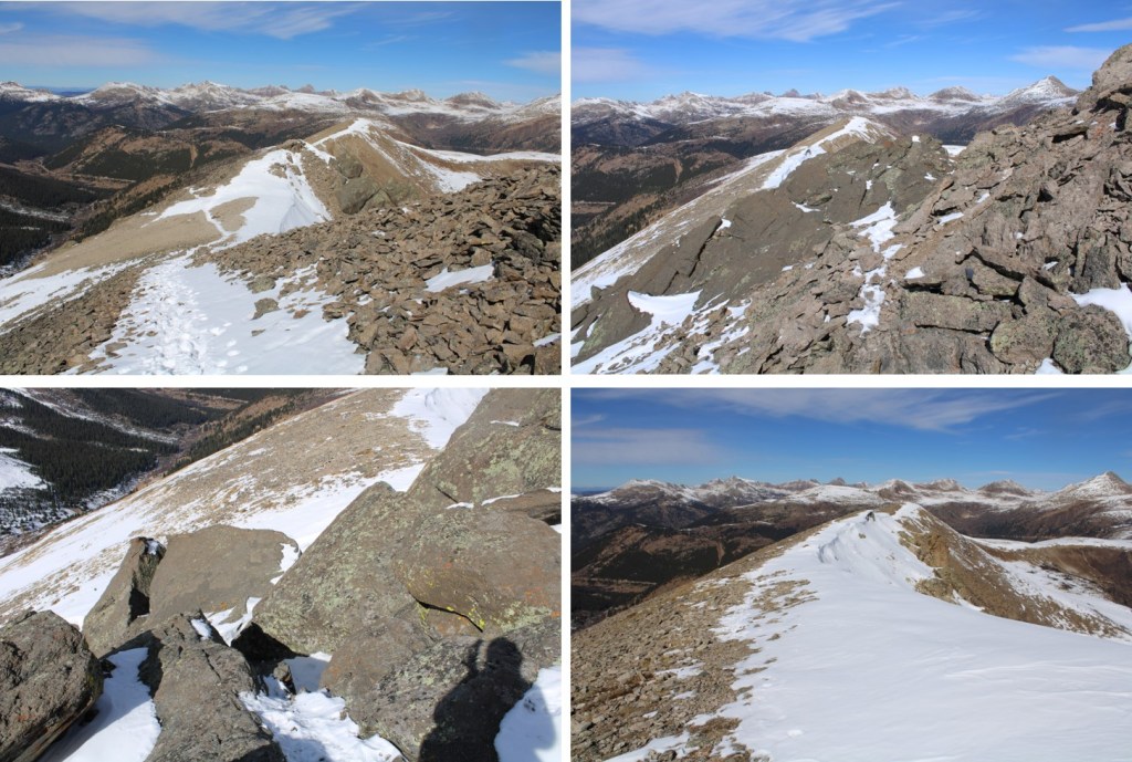 From the summit of Igloo Peak, the trail towards Mountain Boy immediately gets fun. It’s class 2 from here on out, with one brief class 3 move (or two… it’s a chimney). Now is a good time to put on your microspikes. I continued southeast, heading down this briefly class 3 chimney