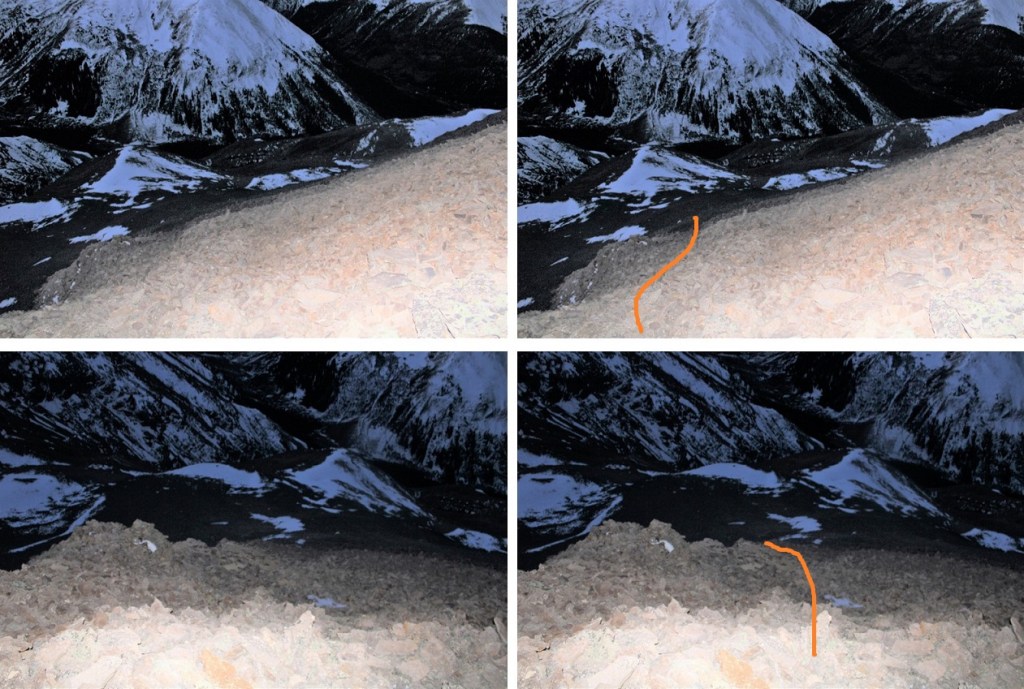 Since the sun was still rising, my view wasn’t that great. Here’s what I saw as I was descending, following the contour of the drainages. This is choose your own adventure, but it’ll be obvious when the drainages end. Don’t descend too early.